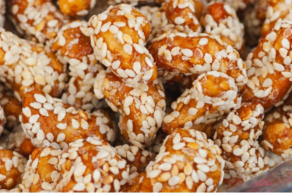 A castanha de caju caramelizada com gergelim é uma versão adocicada e crocante dessa oleaginosa, onde as castanhas são envolvidas em uma camada de açúcar caramelizado e cobertas com sementes de gergelim. Essa combinação resulta em um snack irresistível, com um sabor equilibrado entre o doce do caramelo e o toque levemente tostado do gergelim.